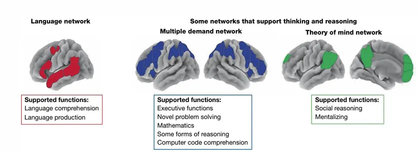 Regarding higher cognitive functions, research shows that language is not always the limiting factor for thought. Recent work argues that language functions primarily as a tool for communication, and while it is crucial as a medium for learning and memory, it is not indispensable for conceptual or mathematical reasoning (Fedorenko et al., 2003). Fedorenko et al. (2003) suggest that neural networks supporting functions like mathematical reasoning are distinct from language networks and that children with linguistic deficits, such as aphasia, do not necessarily show substantial impairments in non-linguistic thought tasks. Language, therefore, can be seen as a structural scaffold, a vehicle for organizing, transmitting, and retaining knowledge, rather than as the sole determinant of cognition!