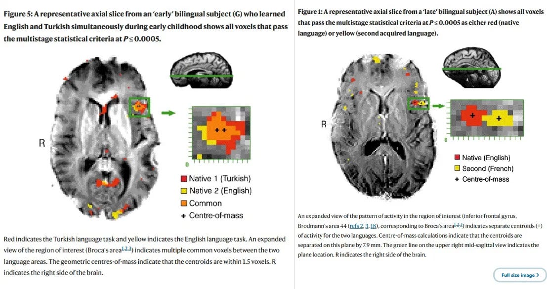 Kim, K. H., Relkin, N. R., Lee, K. M., & Hirsch, J. (1997). Distinct cortical areas associated with native and second languages. Nature, 388(6638), 171-174. https://doi.org/10.1038/38481