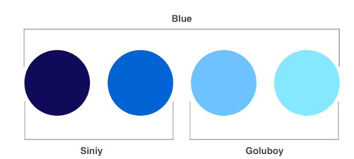 Newer studies found that colour perception is also dependent on our language, specifically our vocabulary. Some languages have many words for colours, while others have only a few, "light" and "dark." Languages also differ in where they put boundaries between colours. While English uses the single word "blue" for many shades, Russian requires speakers to distinguish between light blue (goluboy) and dark blue (siniy). This constant linguistic practice sharpens their perception. Studies show that Russian speakers are measurably faster at discriminating between light and dark blue shades. This cognitive difference is also reflected in brain activity. When viewing colours shifting from light to dark blue, the brains of Russian speakers react as if a categorical change has occurred, while the brains of English speakers, who lack this linguistic boundary, do not register the same "surprise" (Winawer et al. 2007; Boroditsky, 2018).