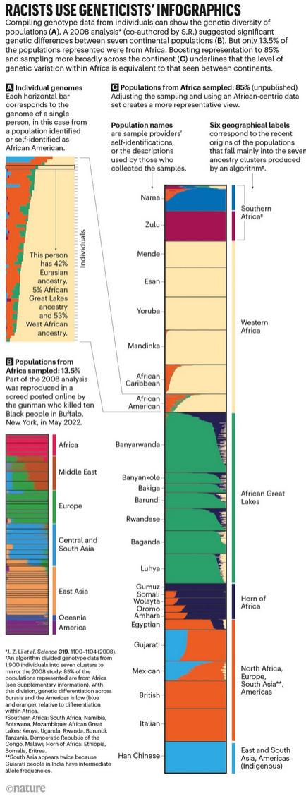 Our unpublished analysis shows that if the authors of the 2008 study had had access to more diverse dataset— with 85% of the populations selected from within Africa, and the other 15% from outside the continent — and had allowed for seven subdivisions of genetic ancestry as in the original study, the data from African populations would no longer fall into a neat cluster that lies apart from all the others (see ‘Racists use geneticists’ infographics’)