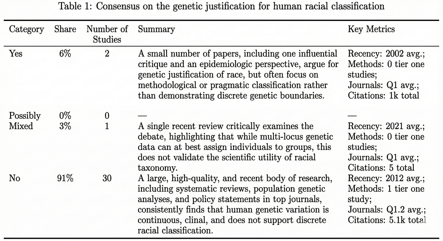 I do not want to deny that some PCA studies using structure plots have produced what look like distinct genetic clusters that could, at first glance, be interpreted as “races.” Furthermore there are indeed a few studies that argue in favour of the classification in human races (see. Pigliucci, 2003). However, across the broader literature, this is not the scientific consensus. In my own review, only a small minority of studies suggested discrete racial groupings. Notably, and without this being a value judgment, those arguing in favor of racial categories were often philosophical in nature, whereas studies arguing against them were predominantly biological. The large majority of studies did not support discrete racial groupings.