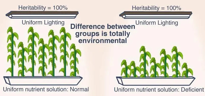 As Lewontin (1970) famously argued, traits can show high heritability within groups while group differences are entirely environmentally driven. Consider the analogy of genetically identical plants grown in different pots. If both groups have a heritability of 100% for height, but one group receives adequate nutrients while the other receives a deficient nutrient solution, the latter will grow less tall despite identical genetic potential. This demonstrates that environmental conditions determine how genetic potential is expressed phenotypically. In the same way, environmental constraints shape cognitive development even when heritability estimates are high.