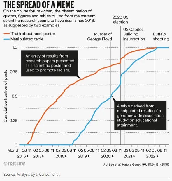 A more modern example comes from Carlson et al. (2022), who found in their analysis that research papers portraying human populations as distinct biological clusters, through structure plots and FST values that can easily be misinterpreted as evidence for subspecies, correlate with increasingly violent behavior. While this should not be interpreted causally, in our polarized world where information is increasingly misused, we can see that such framing culminates in horrible events like the Buffalo shooting, which was partly justified through the uncritical misappropriation of scientific studies.